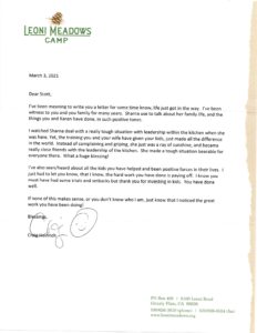 This letter came unexpectedly and was so kind and thoughtful that I wanted to save it somewhere. It was from the administrator of the Leoni Meadows Camp, where our daughter worked for a summer. It was about our youngest daughter, Sharna, and how she behaved and spoke about her family life.