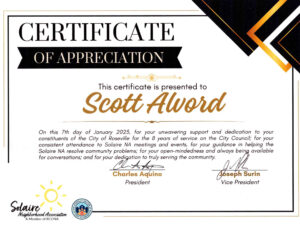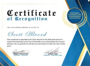 Before, during, and after my city council service, I have continually been present in neighborhood association meetings at least anywhere near where I lived. These were my neighbors and I wanted to support them and provide any information or assistance where possible. It was very sweet and thoughtful for them to present me with a Certificate of Recognition in early 2025. These certificates are from the Westpark Neighborhood Association and Fiddyment Farm Neighborhood Association (combined certificate), and the Solaire Neighborhood Association.