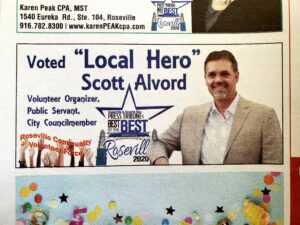 Because of my work with the Roseville Volunteer Force during the height of the pandemic, the community voted me as "Local Hero" in the Press Tribune's Best-of-the-Best Awards. The link above should jump to the RVF section of the Community Service & Positions page where you can read more about the effort our 2,000+ army of volunteers gave to provide toilet paper, masks, computers, sanitizer, wipes, and much more to our community, including raising a lot of funding for homeless services.